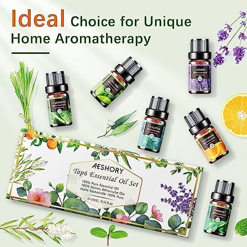 AESHORY Set de Aceites Esenciales para Humidificador, TOP 6 x 10ML Aceite Aromáticos Natural, Aceites Esenciales Aromaterapia para Difusor, SPA – Lavanda, Menta, Árbol de Té, Eucalipto, Naranja Dulce