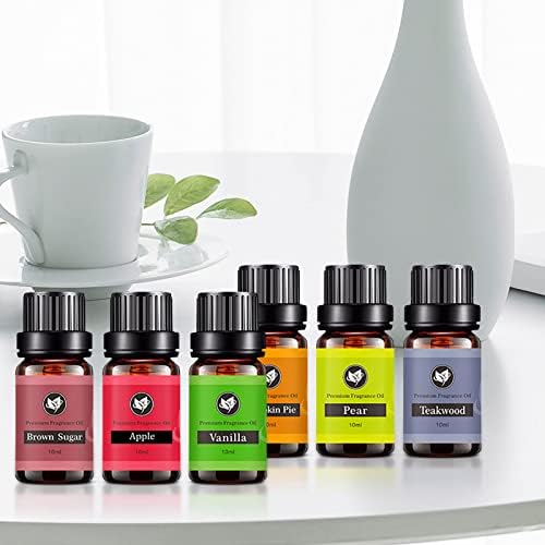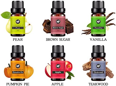 El juego de aceites esenciales contiene 6 botellas individuales de 10 ml en los aromas: azúcar morena, vainilla, pastel de calabaza, pera y madera de teca. Materias primas 100% puras, naturales y seguras, libres de aditivos y varios nocivos. Puede ser ampliamente utilizado en aromaterapia, aceite de masaje corporal, cuidado del cabello, vaporizador, spa, etc. El regalo perfecto para Navidad, Acción de Gracias, cumpleaños, bodas y mucho más.
