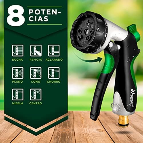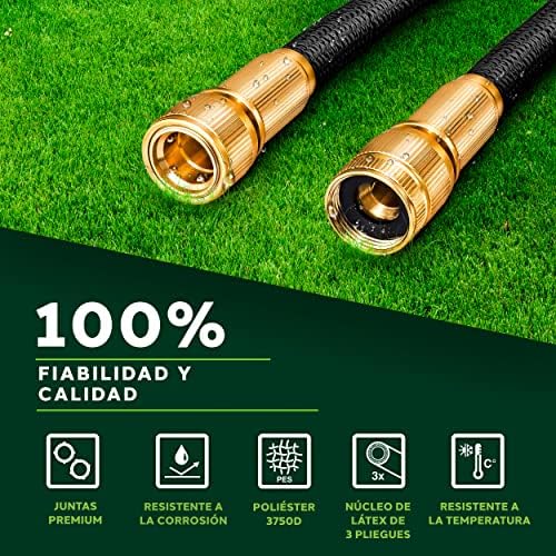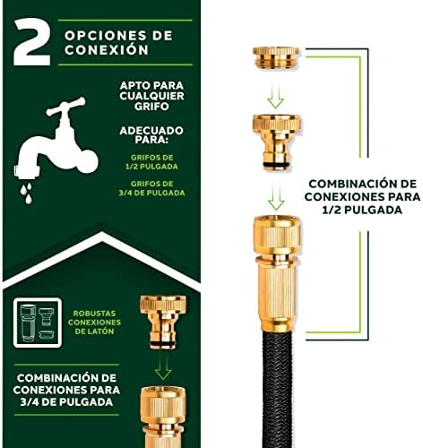 Con un fuerte tejido de plástico resistente a la abrasión, manguera de agua flexible, que se puede extender hasta 3 veces su longitud original y es adecuada para presiones de hasta 10 bar. Los adaptadores para la conexión en el grifo están incluidos para los tamaños de 1 pulgada y 3 de 4 pulgadas.